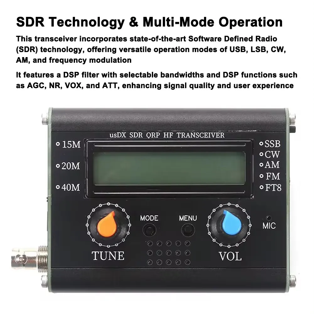 This is a full mode shortwave QRP SSB/CW transceiver. Simple, fun and versatile QRP SSB HF transceiver with embedded DSP and SDR functions. EER Class-E driven SSB transmit-stage. Ultra-small size design makes it easy to carry and use. It has a 1602N screen, a built-in microphone and a built-in speaker to ensure superior performance. It can be connected to an automatic key, and can be decoded by CW. Supports a variety of communication modes, including SSB, CW, AM, and Frequency Modulation, as well as DSP filtering and functions, such as AGC, NR, and VOX, to provide a professional communication experience. Its technological sophistication, portability, efficiency, customizability, and ease of use, suitable for a variety of radio enthusiasts.
