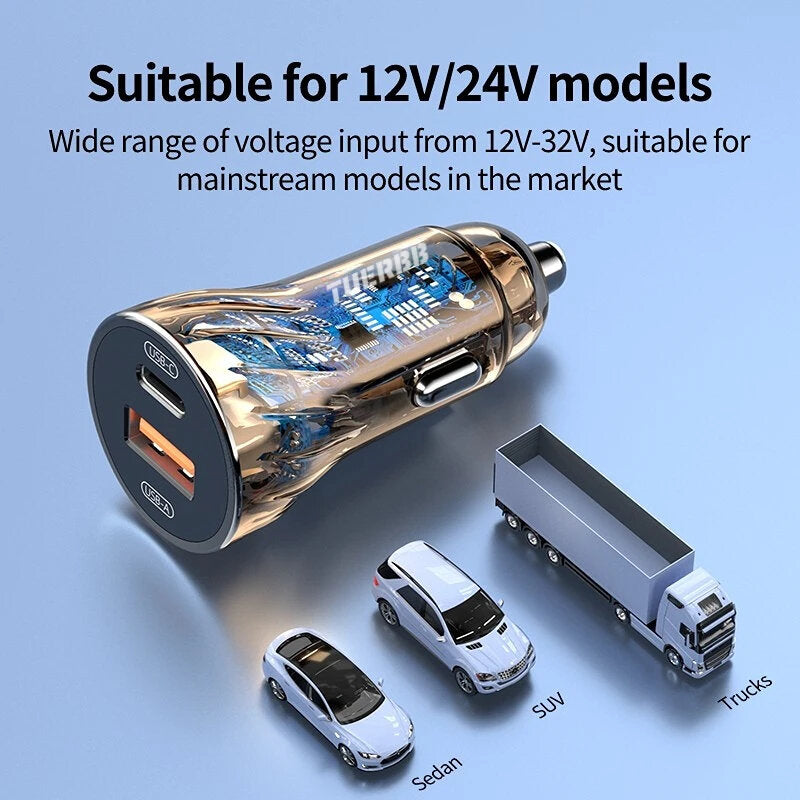 • TUERBB 52.5W fast USB-C car charger supporting PD 30W(Max) and QC 22.5W(Max) high output can fast charge all prevailing phones simultaneously.