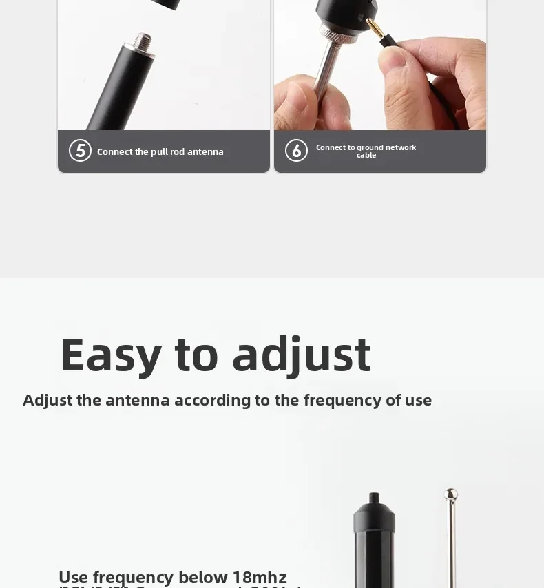 - Para frecuencias inferiores a 18 MHz, tire de la "antena de varilla" a su longitud máxima y use una "bobina de sintonización" para sintonizar y lograr una ROE óptima.